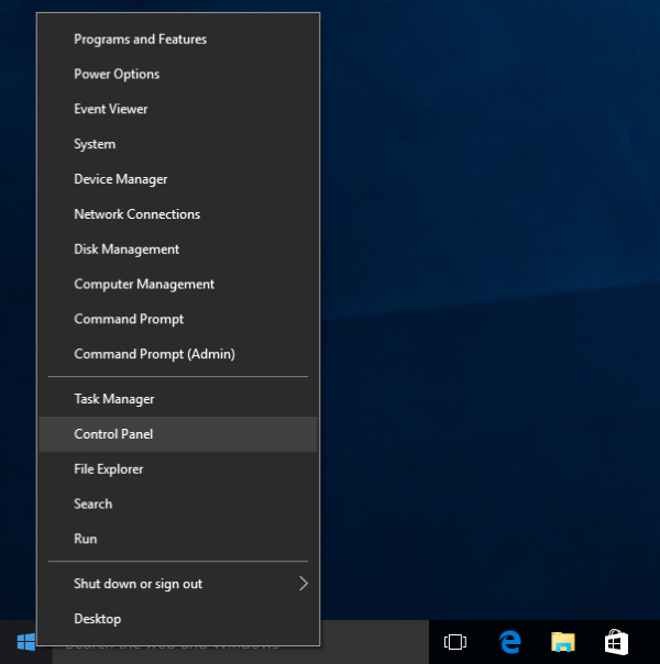Right-click on the Windows icon in the left bottom corner of the screen, and then click on Control Panel.